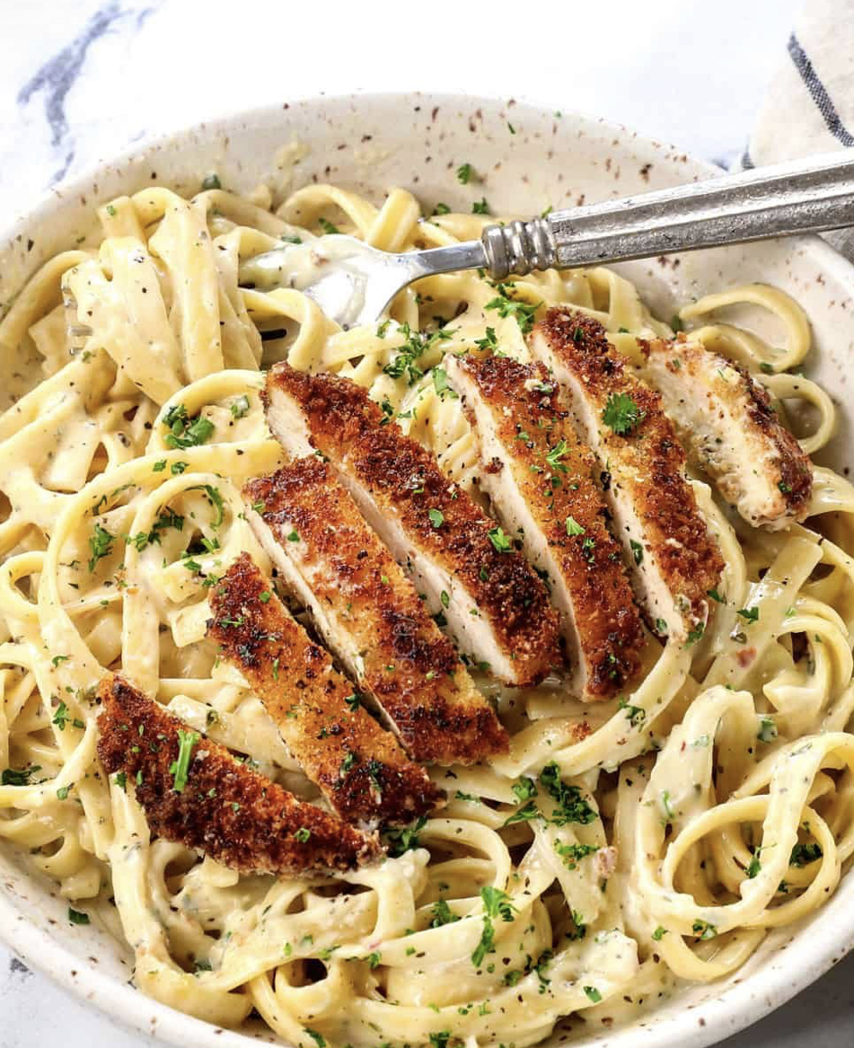 White sauce pasta with fried chicken