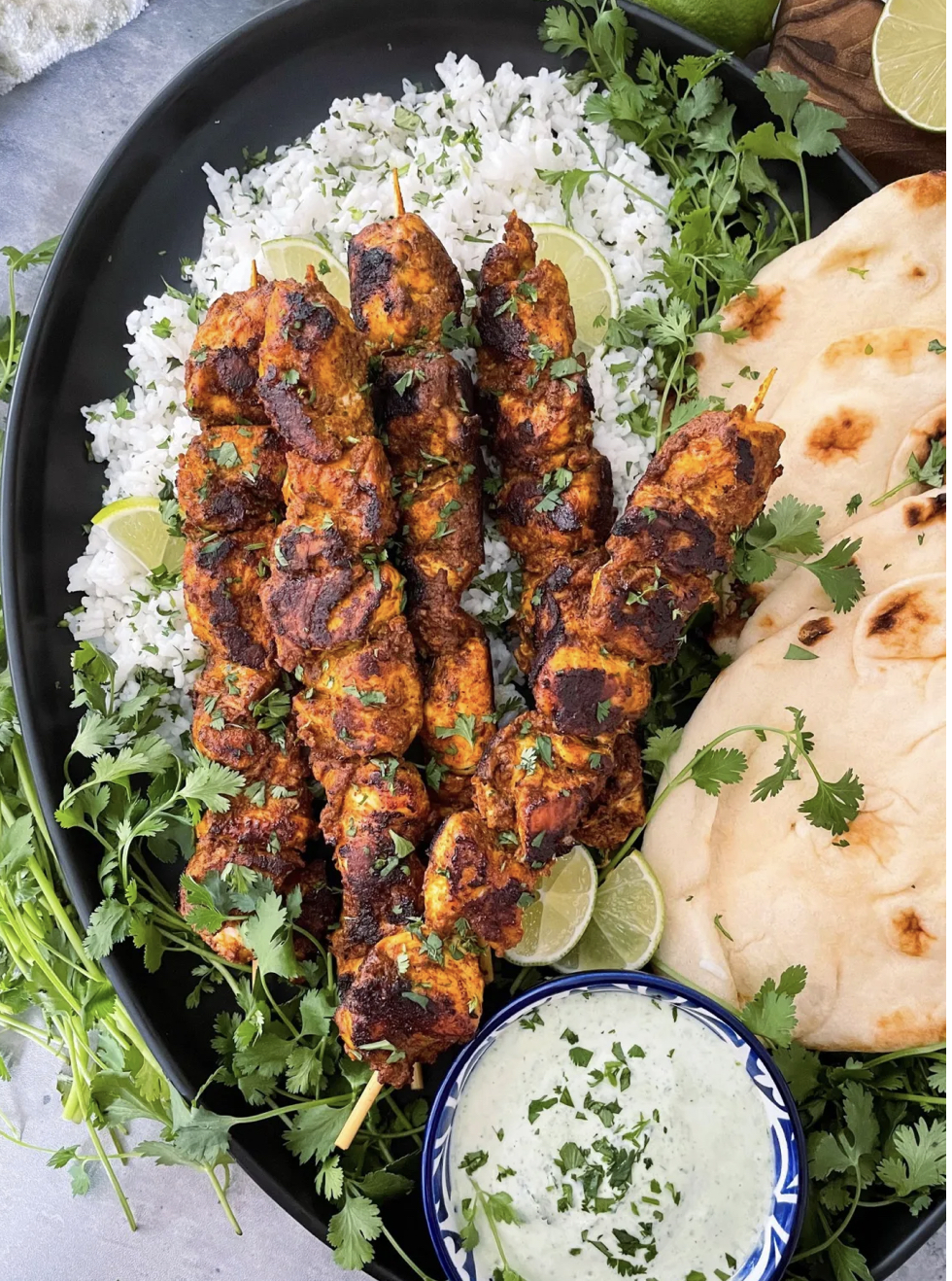 chicken tikka masala with creamy cilantro lime dipping sauce with cilantro lime rice and some warm naan bread